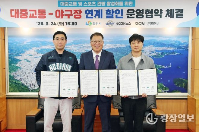 광장일보 주재영 기자 | 창원특례시와 NC 다이노스, ㈜마이비는 24일 창원시청에서 시내버스-야구장 연계 할인 서비스 제공을 위한 업무협약을 체결했다.