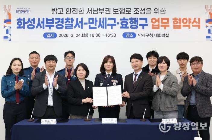 광장일보 나병석 기자 | 화성특례시 만세구는 24일 만세구청 대회의실에서 화성서부경찰서, 효행구청과 함께 ‘밝고 안전한 서남부권 보행로 조성을 위한 업무협약(MOU)’을 체결했다고 밝혔다.