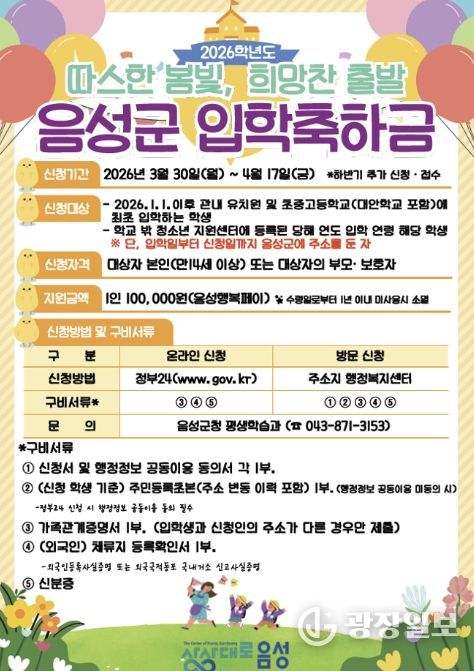 광장일보 이현나 기자 | 음성군은 올해 2026학년도 입학을 맞아 관내 유치원과 초·중·고등학교 입학생, 그리고 학교 밖 청소년지원센터에 등록된 입학 연령에 해당되는 청소년을 대상으로 입학축하금을 지원한다고 밝혔다.