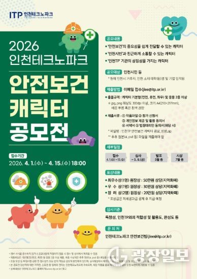 광장일보 주재영 기자 | 인천테크노파크(인천TP)는 오는 4월 1일부터 인천시민과 함께 안전보건 공감대 형성을 위한 ‘2026년 인천테크노파크 안전보건 캐릭터 공모전’을 개최한다.