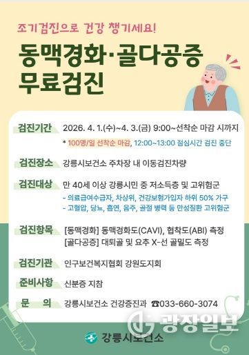 광장일보 이현나 기자 | 강릉시보건소는 오는 4월 1일부터 3일까지 인구보건복지협회 강원도지회와 연계하여 동맥경화 및 골다공증 무료검진을 실시한다.