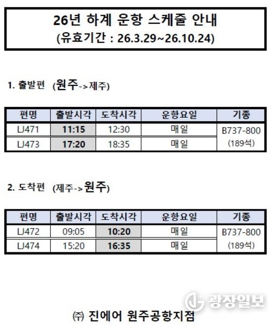 광장일보 이현나 기자 | 원주공항의 2026년 하계(3월 29일∼10월 24일) 제주 항공편이 동계와 같이 오전·오후 시간대 편성으로 유지된다.
