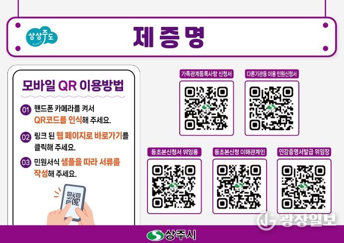 광장일보 주재영 기자 | 상주시는 민원서식 작성에 어려움을 겪는 시민들의 불편을 해소하고 민원 처리의 편의성을 높이기 위해 QR코드를 활용한 ‘민원서류 작성 예시 안내 서비스’를 도입한다고 밝혔다.