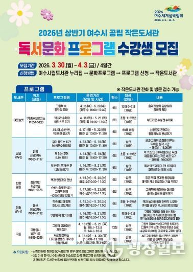 광장일보 주재영 기자 | 여수시는 오는 3월 30일부터 4월 3일까지 공립 작은도서관 ‘2026년 상반기 독서문화 프로그램’ 수강생을 모집한다고 밝혔다.