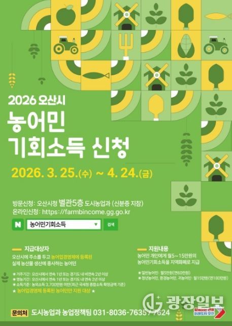 광장일보 나병석 기자 | 오산시는 농업·농촌의 공익적 가치 보장과 농어촌 소멸위기 대응을 위해 ‘2026년 농어민 기회소득’ 신청·접수를 3월 25일부터 4월 24일까지 진행한다고 밝혔다.