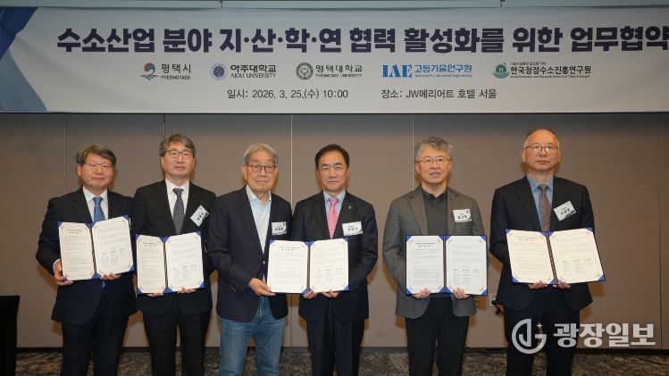 광장일보 박균현 기자 | 평택시는 25일, 아주대학교·평택대학교·고등기술연구원·한국청정수소진흥연구원과 '수소산업 분야 지산학연 협력 활성화를 위한 업무협약(MOU)'을 체결했다고 밝혔다.