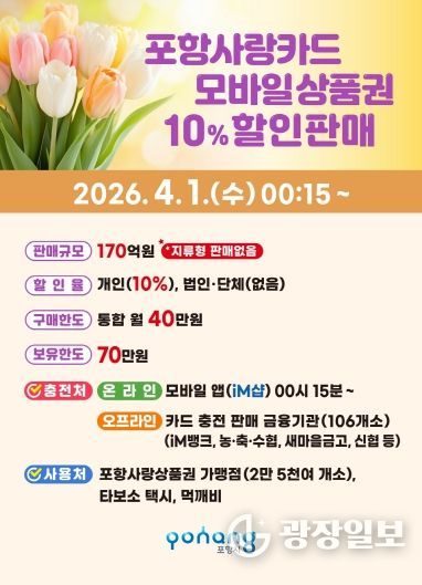 광장일보 주재영 기자 | 포항시가 지역 경제에 활력을 불어넣기 위해 내달 1일부터 카드형·모바일 포항사랑상품권(포항사랑카드) 170억 원을 10% 할인된 금액으로 판매한다.