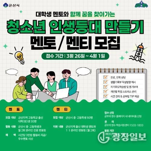 모집 대상은 군산 지역 고교 출신 대학생 또는 대학원생 멘토 30명과 관내 중·고등학생 멘티 60명이며, 모집기간은 3월 26일부터 4월 1일까지이다.