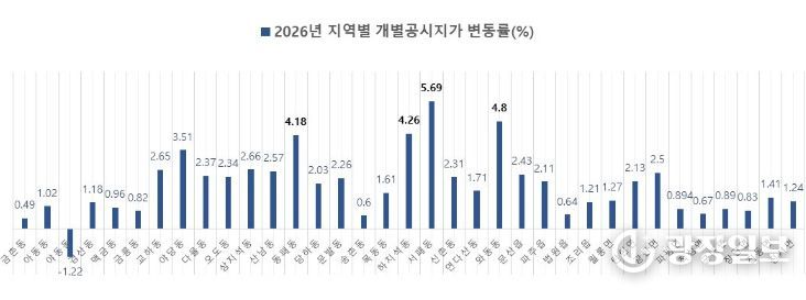 지역별 상승률은 메디컬클러스터 등 개발 수요의 영향으로 운정지역 서패동 5.69%, 와동동 4.8%, 하지석동 4.26%, 동패동 4.18%로 다소 높게 나타났다. 개별토지 기준 최고 지가는 금촌동 54-27번지 상업용지가 제곱미터(㎡)당 5,765,000원, 와동동 1472-1번지 중심상업용지가 제곱미터(㎡)당 5,243,000원으로 확인됐다.