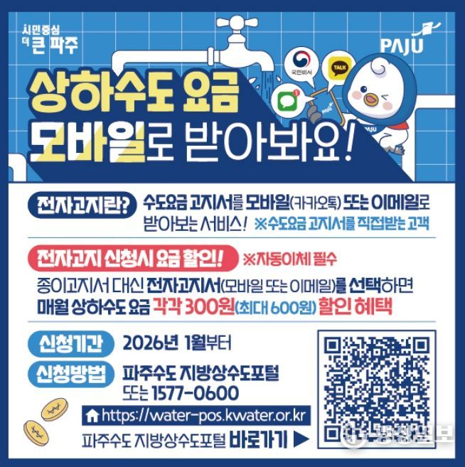 전자고지 신청은 파주수도 지방상수도포털, 국민비서 누리집, 한국수자원공사 고객센터를 통해 가능하다.