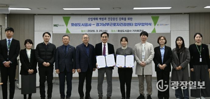 광장일보 나병석 기자 | 화성도시공사는 25일 경기남부근로자건강센터(경기남부직업트라우마센터)와 근로자 건강증진과 직업 트라우마 예방, 심리 지원체계 강화를 위한 업무협약을 체결했다고 밝혔다.