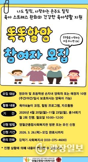 광장일보 이현나 기자 | 영월군종합사회복지관은 손자녀를 양육하는 보호자의 육아 스트레스 완화와 건강한 양육 환경 조성을 위해 프로그램 ‘똑똑할맘’ 참여자를 모집한다.