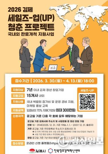 광장일보 주재영 기자 | 김제시는 청년 창업기업의 시장 진출 확대와 매출 증대를 지원하기 위해 청년 창업기업 판로개척 지원 사업'2026년 김제시 세일즈-업(UP) 청춘 프로젝트'를 본격 추진한다고 밝혔다.