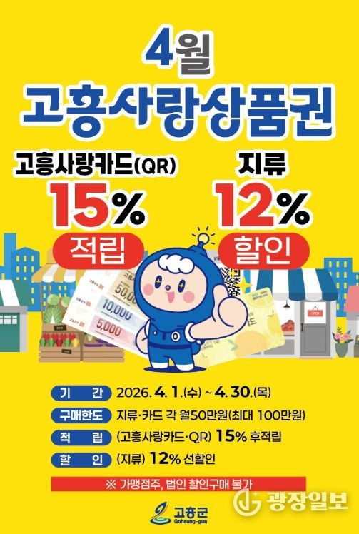 광장일보 주재영 기자 | 고흥군은 지난 1월부터 3월까지 진행한 고흥사랑상품권 특별할인 행사의 뜨거운 성원에 힘입어, 오는 4월 1일부터 한 달간 고흥사랑상품권 할인 혜택을 연장 운영하며 민생경제에 온기를 더한다.