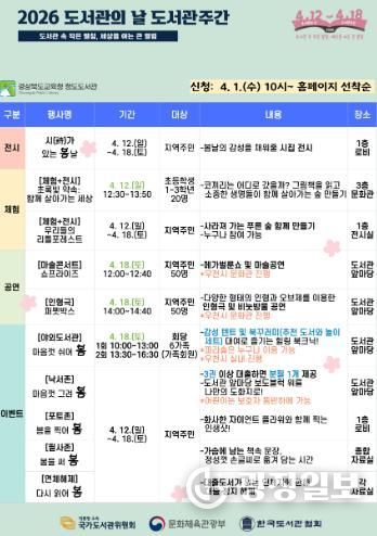 광장일보 주재영 기자 | 경상북도교육청 청도도서관은 2026년 도서관의 날(4. 12.)과 도서관주간(4. 12.~18.)을 맞아 ‘도서관 속 작은 펼침, 세상을 여는 큰 열림’이라는 주제로 다채로운 문화 행사를 운영한다.