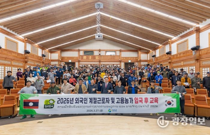 칠곡군에서는 해마다 도입 인원이 늘어나고 있는 외국인 계절근로자의 국내 생활 안전을 도모하고 근로 과정 갈등 예방을 위해 고용농가와 근로자를 대상으로 3월 27일2026년 외국인 계절근로자 및 고용농가 입국 후 교육실시했다.