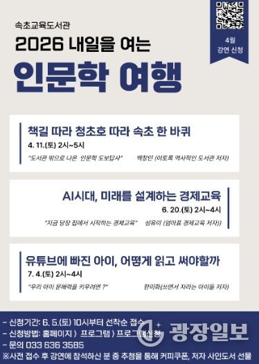 주요 프로그램은 △4월 11일 백창민 작가와 ‘책길따라, 청초호따라, 속초 한 바퀴’ △6월 20일 성유미 작가의 ‘AI시대, 미래를 설계하는 경제교육’ △7월 4일 한미화 작가의 ‘유튜브에 빠진 아이, 어떻게 읽고 써야 할까’ 등으로 구성됐다.