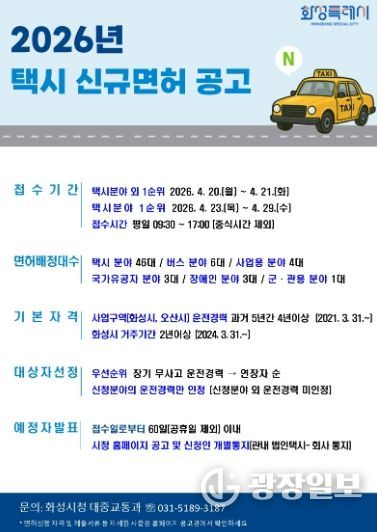 면허 신청 접수는 화성특례시청 민원실에서 진행하며 분야별로 접수 기간이 다르다. ▲택시 분야 외 1순위는 4월 20일부터 21일까지 ▲택시 분야 1순위는 4월 23일부터 29일까지 접수한다. 시는 이후 면허 심사와 예정자 공고, 이의신청 기간을 거쳐 오는 7월 중 신규 면허 발급 대상자를 최종 확정하고 면허증을 수여할 계획이다.