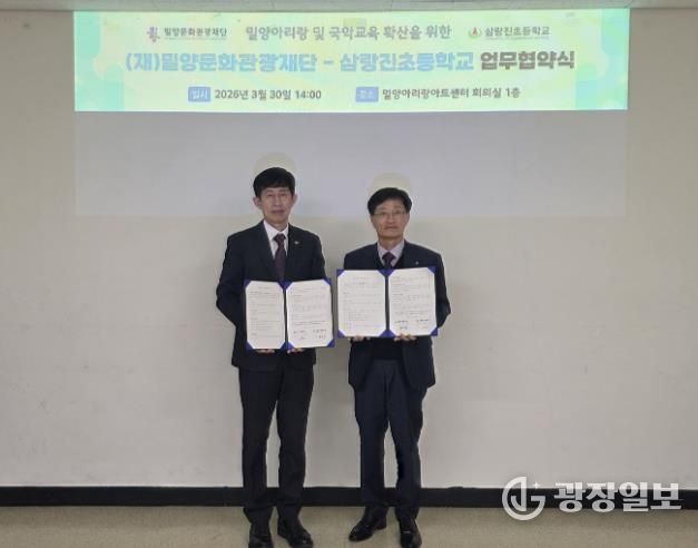 광장일보 주재영 기자 | 밀양문화관광재단은 30일 밀양아리랑아트센터에서 삼랑진초등학교와 밀양아리랑 전승 기반 강화 및 국악 교육 진흥을 위한 업무협약을 체결했다.