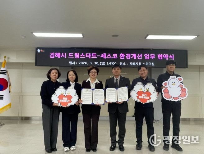 광장일보 주재영 기자 | 김해시는 지난 30일 주거 환경이 열악한 취약계층 아동 가구를 대상으로 ‘2026년 드림스타트 꿈을 키우는 클린 홈 사업’을 추진하기 위해 세스코홈케어와 업무 협약을 체결했다고 밝혔다.