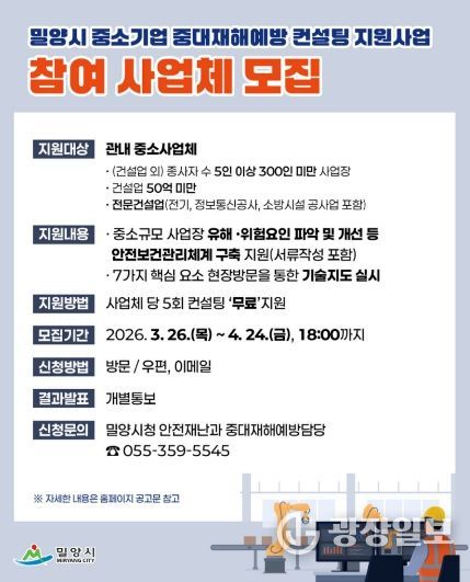 광장일보 주재영 기자 | 경남 밀양시는 안전보건관리체계 구축에 어려움을 겪는 관내 중소기업을 대상으로 ‘2026년 밀양시 중대재해예방 컨설팅’ 사업을 추진한다고 밝혔다.