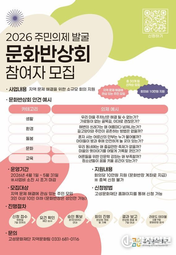 광장일보 이현나 기자 | 고성문화재단은 주민 스스로 지역의 문제를 진단하고 대안을 모색하는 2026 주민의제 발굴 '문화반상회' 참여 모임을 오는 4월 1일 수요일부터 5월 31일 일요일까지 모집한다.
