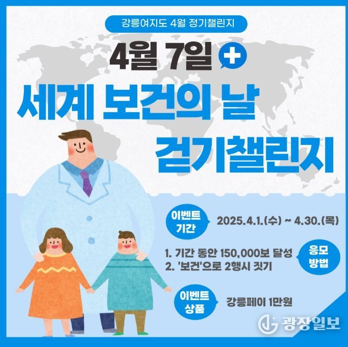 광장일보 이현나 기자 | 강릉시는 4월 7일 보건의 날을 맞아 시민들의 건강생활 실천 분위기 조성을 위해 '보건의 날 기념 걷기챌린지'와 '걷기동아리 명품길 걷기프로그램'을 운영한다.