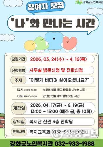 광장일보 주재영 기자 | 강화군노인복지관이 어르신들의 정서적 안정과 사회적 관계 형성을 지원하는 이야기 나눔 모임 '‘나’와 만나는 시간'의 참여자를 모집한다고 밝혔다.
