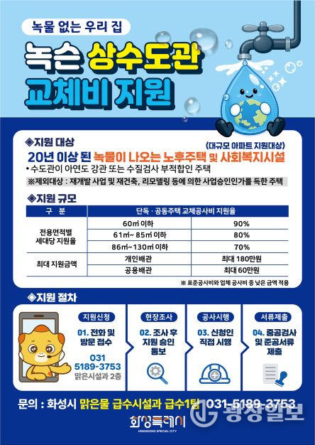 화성특례시는 20년 이상 경과한 노후주택과 사회복지시설을 대상으로 녹물이 발생하는 옥내 급수관과 공동주택 공용배관 교체 및 세척 비용을 지원하는 '2026년 녹물 없는 우리집 수도관 개량 지원사업'을 추진한다고 밝혔다. 단독주택의 경우 세대당 최대 180만 원, 공동주택 공용배관은 최대 60만 원까지 지원된다. 기초생활수급자와 차상위계층 소유 주택은 전액 무료로 지원되며, 지원율은 전용면적에 따라 70~90% 수준이다. 총사업비는 9660만 원으로, 예산 소진 시까지 신청이 가능하다. 신청자는 시청 홈페이지에서 서류를 내려받아 작성 후 맑은물사업소를 방문해 접수하면 된다. 지원 대상자는 현장실사를 거쳐 선정되며, 노후주택과 취약계층 가구가 우선적으로 지원된다.