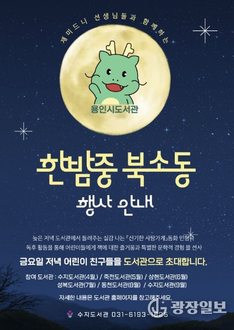 광장일보 주재영 기자 | 용인특례시 서부도서관은 수지‧죽전‧상현‧성복‧동천도서관에서 야간 독서문화 프로그램 ‘한밤중 북소동’을 운영한다고 25일 밝혔다.