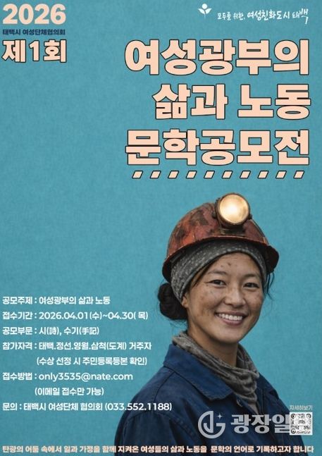 광장일보 이현나 기자 | 태백시 여성단체협의회(회장 김미숙)는 오는 4월 1일부터 30일까지 '2026년 여성광부의 삶과 노동' 문학 공모전을 개최한다고 밝혔다.