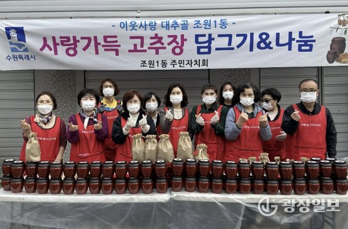 광장일보 박균현 기자 | 수원시 장안구 조원1동 주민자치회는 지난 1일, 복지행정분과 주관으로 ‘사랑가득 고추장 담그기’ 행사를 열고, 직접 담근 고추장을 관내 취약가구 200여 세대에 전달했다.