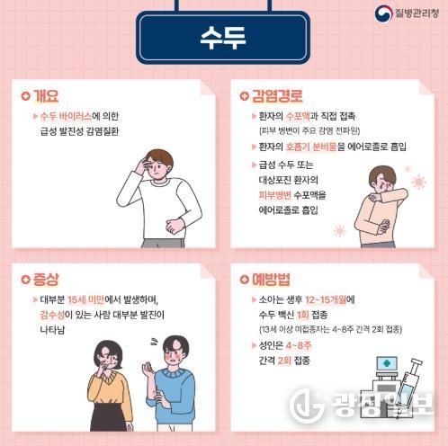 수두와 유행성이하선염은 환자가 기침할 때 나오는 침방울 등 호흡기 분비물을 통해 전파되는 대표적인 감염병이다.