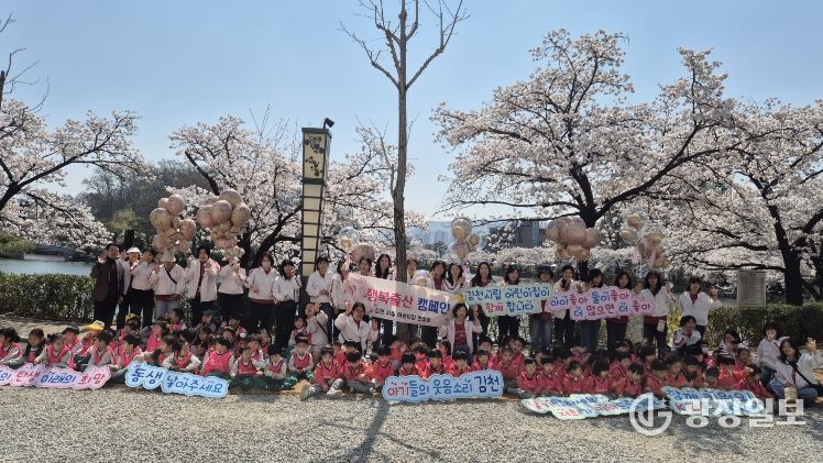 이번 캠페인에는 김천시립어린이집 6개소(모암, 개령, 센트럴자이, 율곡, 지례, 아포)의 원생 및 보육교사 120여 명이 참여해 벚꽃 명소인 연화지 산책로를 따라 이동하며 시민들을 대상으로 출산과 육아의 소중함을 전달했다.