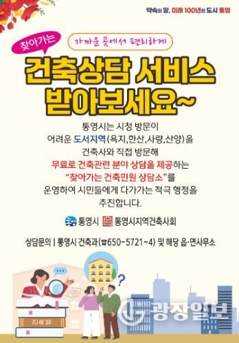 광장일보 주재영 기자 | 통영시는 경제적, 시간적 부담으로 인해 시청 방문이 어려운 도서지역(욕지, 한산, 사량, 산양) 시민을 대상으로 건축사와 직접 방문해 무료로 건축 관련 분야 상담을 제공하는 ‘찾아가는 건축민원 상담실’을 운영해 시민들에게 다가가는 적극행정을 추진한다고 2일 밝혔다.