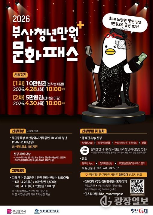 다만, ‘2026년 청년문화예술패스’ 대상자(2006~2007년생)와 2024년~2025년 사업 수혜자(부산청년만원+문화패스, 청년문화예술패스)는 중복 지원 방지를 위해 이번 신청에서 제외된다.