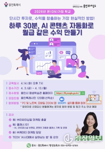 광장일보 주재영 기자 | 용인특례시는 오는 13일까지 ‘하루 20분, AI 콘텐츠 자동화로 월급 같은 수익 만들기’를 주제로 한 ‘2026년 온가정학교’ 온라인 특강 수강생을 모집한다고 3일 밝혔다.
