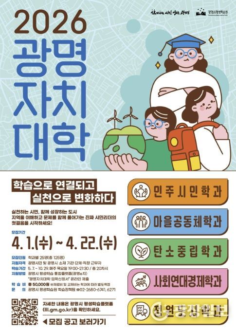 광장일보 주재영 기자 | 광명시가 시의 핵심의제인 평생학습 마을리더 양성과정 ‘광명자치대학’ 2026년 신입생 125명을 오는 22일까지 모집한다.
