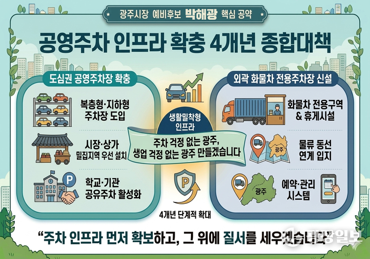 박해광 경기 광주시장 예비후보는 도심 내 불법주차와 교통 혼잡, 그리고 화물차 주차 문제를 동시에 해결하기 위해 단계적인 공영주차장 확대 방안을 발표했다. 박 후보는 경안동, 송정동, 태전·고산지구 등 주차 수요가 높은 지역을 중심으로, 전통시장 및 상가 밀집지역과 같은 생활권에 복층형·지하형 주차장을 도입하겠다고 밝혔다. 또한 유휴부지와 공공시설을 복합적으로 활용하고, 학교 및 공공기관의 공유주차 활성화도 추진할 계획이다.