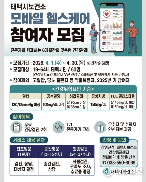 광장일보 이현나 기자 | 태백시는 지역주민의 건강한 생활습관 형성을 지원하기 위해 ‘2026년 모바일헬스케어 사업’ 참여자를 모집한다고 밝혔다.