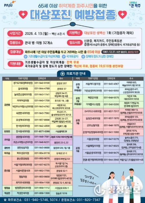 광장일보 주재영 기자 | 파주시는 65세 이상 취약계층 어르신의 건강 보호와 의료비 부담 완화를 위해 취약계층 어르신 대상포진 예방접종 지원사업을 오는 4월 13일부터 시행한다.