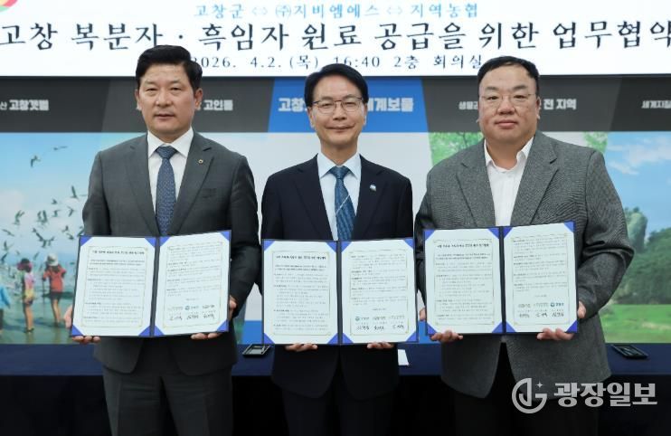 광장일보 주재영 기자 | 고창군이 지난 2일 오후 군청2층 회의실에서 고창군·㈜지비엠에스·지역농협 5개소와 ‘고창 복분자·흑임자 원료 공급 및 상생발전 업무협약(MOU)’을 체결했다.
