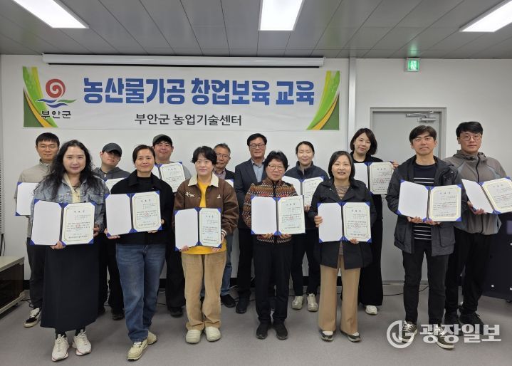 광장일보 주재영 기자 | 부안군농업기술센터(소장 김양녕)는 지난달 4일부터 지난 1일까지 총 9회에 걸쳐 진행된 농산물가공 창업보육 교육을 마무리하고 15명의 교육생이 수료한 가운데 수료식을 개최했다고 밝혔다.