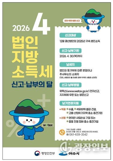 광장일보 주재영 기자 | 여수시는 4월 한 달간 ‘2025년 귀속 법인지방소득세에 대한 집중 신고·납부 기간’을 운영한다고 밝혔다.