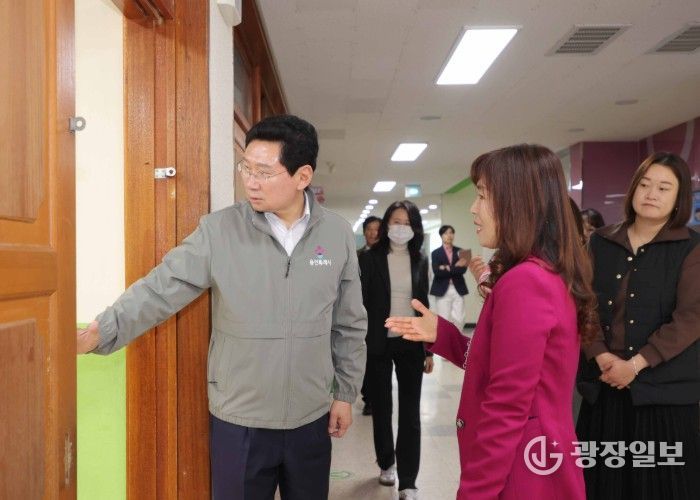 학부모들의 요청에 따라 진행된 이날 교통 봉사에서 이 시장은 교통지도에 앞서 학교 도서관 조성 현장을 방문해 교육환경 개선사업 추진 현황을 확인하고, 학교 관계자들과 함께 통학로와 학교 시설 전반을 점검했다.