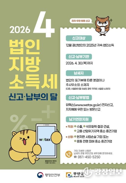 광장일보 주재영 기자 | 전남 무안군은 법인 소득에 대해 지방자치단체에 납부하는 법인지방소득세 신고·납부 기간을 맞아 오는 4월 30일까지 집중신고기간을 운영한다고 밝혔다.