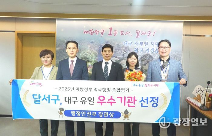광장일보 주재영 기자 | 대구 달서구가 행정안전부 주관‘2025년 지방정부 적극행정 종합평가’에서 대구 자치구 중 유일하게 우수기관으로 선정되고, 장관 표창까지 수상하는 성과를 거뒀다.