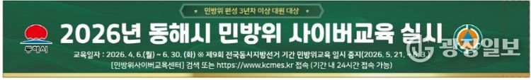 광장일보 이현나 기자 | 동해시는 민방위 대원의 교육 편의성을 높이고 재난 대응 역량을 강화하기 위해 오는 4월 6일부터 6월 30일까지 상반기 민방위 사이버 교육을 실시한다고 밝혔다.