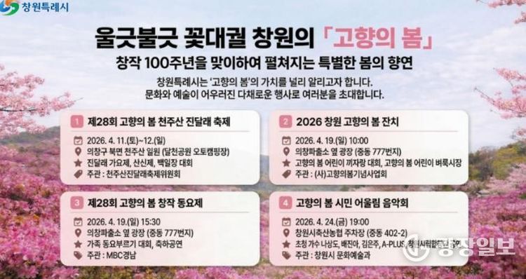 이어 4월 19일에는 의창파출소 옆 광장(중동 777번지 일원) 특설무대에서 '2026 창원 고향의 봄 잔치'와 '제28회 고향의봄 창작 동요제'가 함께 개최된다.