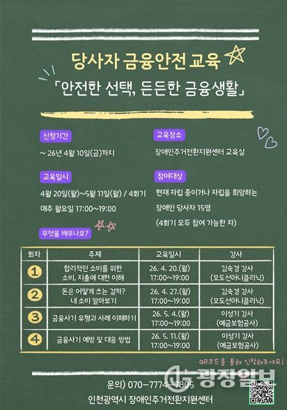 광장일보 주재영 기자 | 인천시사회서비스원 소속 인천시장애인주거전환지원센터는 당사자 금융 안전교육 ‘안전한 선택, 든든한 금융 생활’ 참가자를 모집한다고 6일 밝혔다.